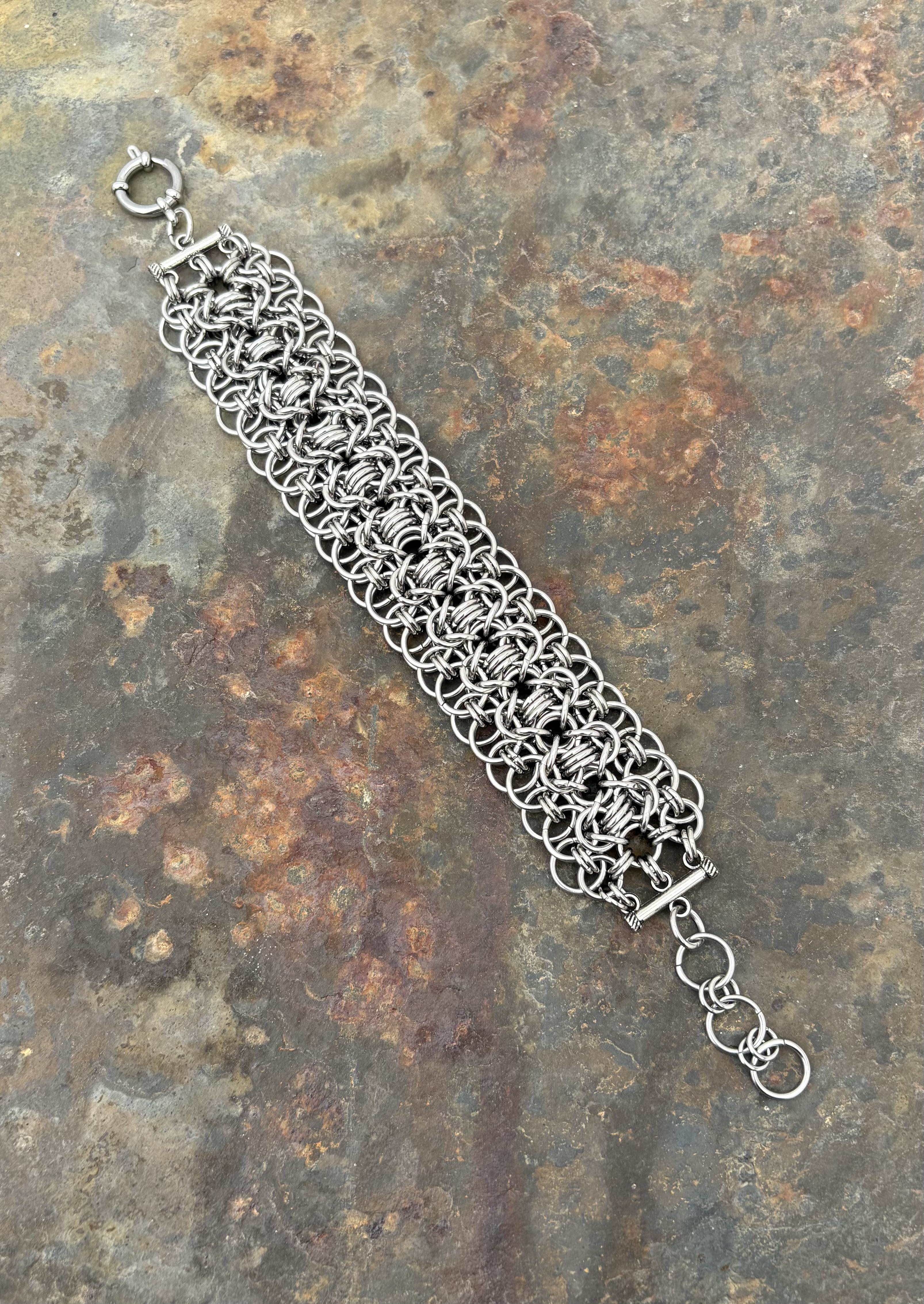 Pulseras tejidas a mano en técnica chainmaille: metal con carácter, diseño que perdura.